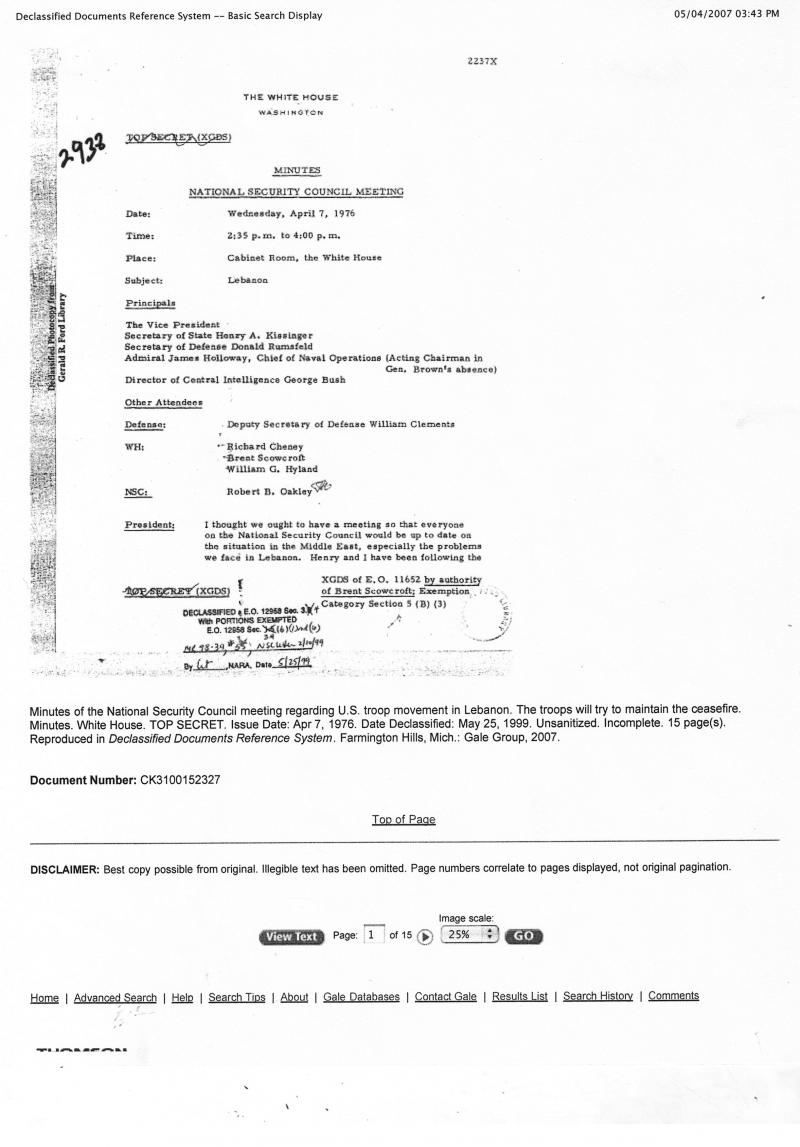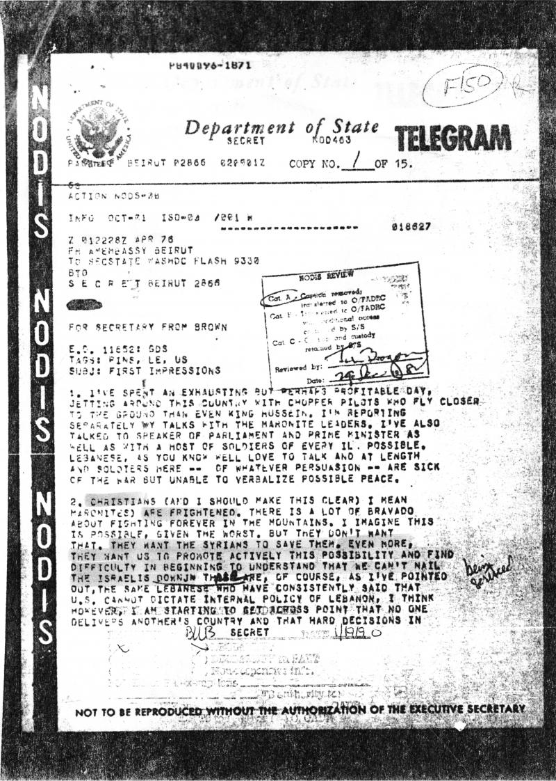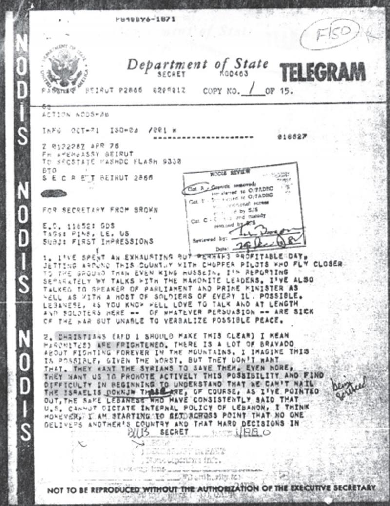نبّهت تقارير وكالة ويكيليكس الى اهمية الوثائق الرسمية الاميركية كمصدر للمعلومات والابحاث والتحاليل عن السياسة الخارجية للولايات المتحدة. ننشر فيما يلي خمس وثائق أميركية عن التدخل العسكري السوري في لبنان في ربيع-صيف العام ١٩٧٦ بعثها المبعوث الاميركي الى لبنان دين براون (نيسان-حزيران ١٩٧٦) الى رئيسه وزير الخارجية الاميركية هنري كيسنجر اضافة الى محضر اجتماعين مخصصين للبنان لاعلى هيئة امنية في البلاد، «مجلس الامن الوطني».
