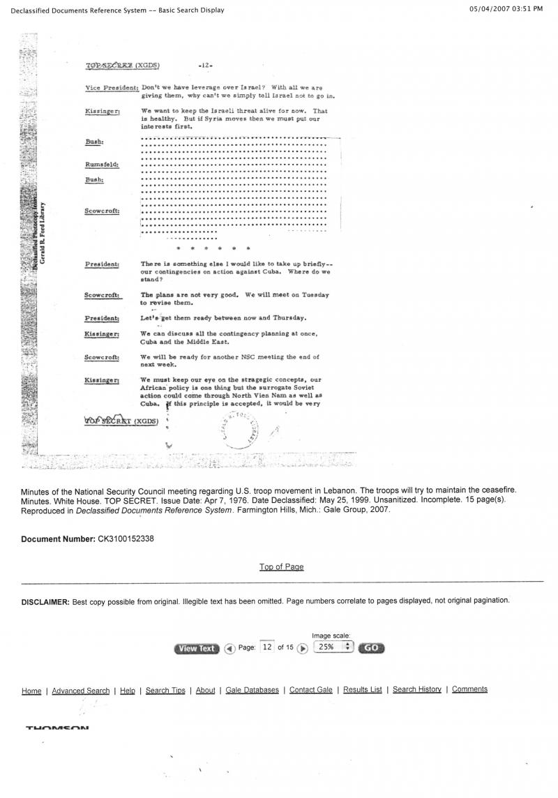 كيسنجر: اعتقد اننا على ما يرام في مسارنا الحالي. واعتقد ان التطورات اللبنانية سوف تفيد في المدى البعيد. اعتقد ان عرفات سوف يفقد نفوذه لصالح [منظمة] «الصاعقة» [الموالية لسورية بقيادة زهير محسن]. وهذا ما سوف يرفع الفيتو الذي تضعه منظمة التحرير الفلسطينية على النشاطات السورية. الخطر هو ان يطاح بالرئيس الاسد.